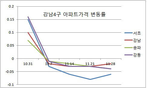 강남4구 아파트 가격은 11·3 부동산 대책이 나온 직후인 지난달 7일 이후 4주 연속 하락세를 이어가고 있다.