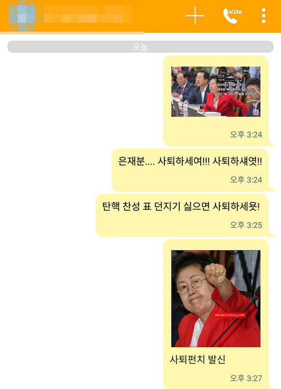 같은 당 이은재 의원은 “탄핵 찬성표 던지기 싫으면 사퇴하세요! 사퇴 펀치 발산!” 이라는 문자를, 김진태 의원은 “생각 좀 하고 삽시다. 강원도 창피하게 하지 마시고” 등의 문자를 받았다.