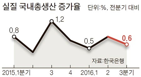 제조업은 삼성전자의 갤럭시노트7 리콜 사태와 자동차업계 파업 등으로 7년6개월 만에 가장 낮은 성장률(-0.9%)을 기록했다. 이로써 한국 경제 성장률은 4분기 연속 0%대 터널에서 벗어나지 못하고 있다.