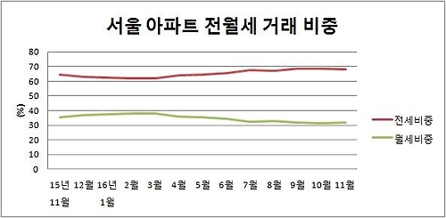 국민은행 월간 통계를 보면 서울 아파트 매매값이 10월 0.72%, 11월엔 0.66% 오른 것으로 조사된 반면 전셋값은 각각 0.32%, 0.27%로 상승폭이 절반에도 못미쳤다.