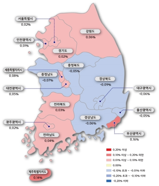 수도권(0.02%)은 지난주보다 상승폭이 축소된 가운데, 지방(0.01%)은 행복도시로의 이주수요가 있는 세종(0.08%)과 부산(0.16%)은 상승폭이 확대됐으나, 주택 공급량이 많았던 충북(0.05%)과 경남(-0.06%) 등은 하락폭이 확대됐고, 울산은 지역경기 침체로 하락 전환됐다.