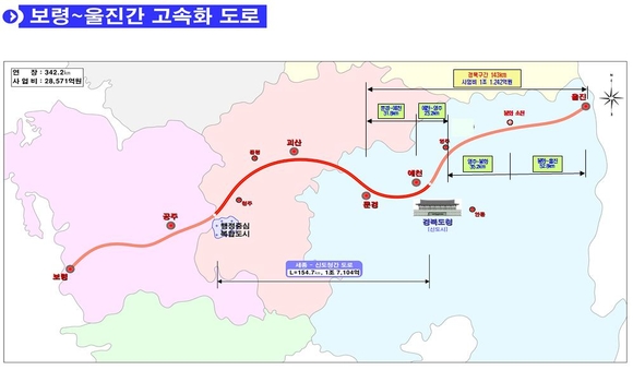 ‘보령~울진간 고속화도로’는 동서5축으로 국토의 중심부를 통과하는 중추적인 역할이 기대되는 사업이다. 총 2조 8571억원이 투입되며, 총연장 342.2㎞의 노선 중 239.6㎞를 신설 또는 개량해 고속화 도로를 건설한다는 계획이다.
