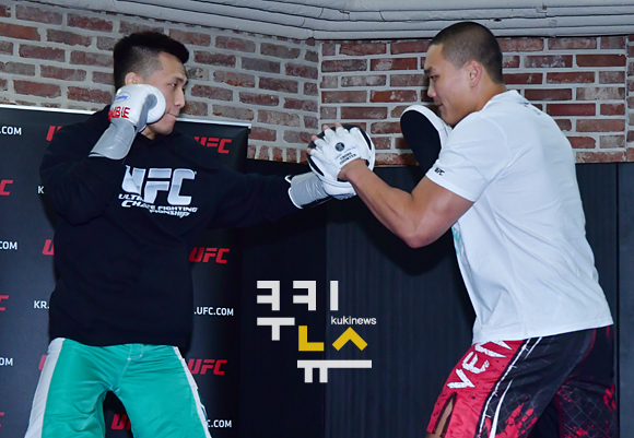 [쿠키뉴스=박태현 기자] 이종격투기 정찬성 선수가 4일 오후 서울 역삼로 코리안좀비 종합격투기 체육관에서 공개훈련을 하고 있다.