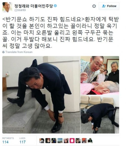 더불어민주당 정청래 전 의원은 16일 반기문 전 유엔 사무총장의 '턱받이 논란'과 관련해 "오른발 올리고 왼쪽 구두끈 묶는 꼴"이라고 맹비난 했다.