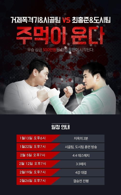 ‘주먹이운다’는 22일 훈련방송으로 땔감 얹은 지게를 메고 산을 오르는 시골팀과 고급스러운 체육관에서 인바디를 측정하는 도시팀으로 나누어 상반된 재미를 보여줄 예정이다. 훈련이 끝나면 내달 5일부터 26일 결승까지 매주 일요일마다 4대4 데스매치, 3대3매치, 4강 대결과 결승전을 차례로 진행한다.