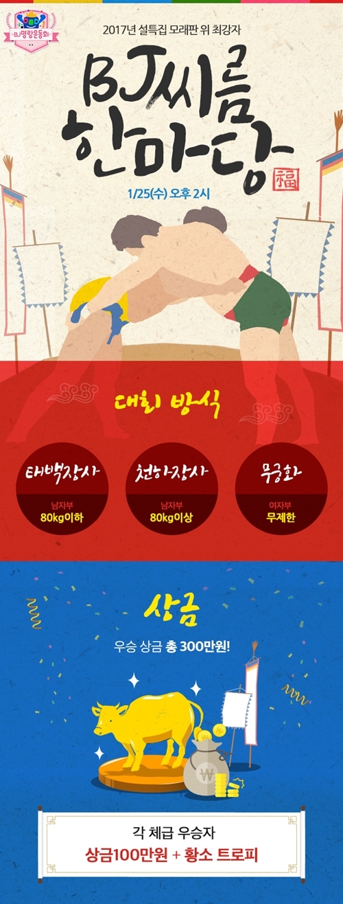 아프리카TV는 설 특집으로 25일 오후 2시부터 5시 30분까지 평택 이충레포츠공원 씨름전용경기장에서 ‘제2회 방송 자키(BJ) 씨름 한마당’을 진행한다고 밝혔다.