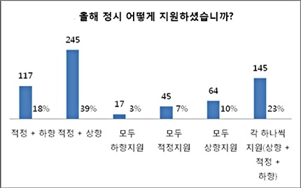 이어 많았던 응답은 정시 3개 군을 놓고 △각 하나씩 지원한 ‘상향+적정+하향’ 비율이 23%(145명) △‘적정+하향’이 18%(117명) △‘모두 상향’ 10%(64명) △‘모두 적정’ 7%(45명) △‘모두 하향’ 3%(17명) 순으로 나타났다.