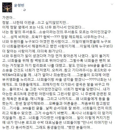 또 윤형빈은 “너희는 나에게도, 대중들에게도 피해자인 척 다가와서 결국은 말을 바꾸고 마는, 돌아보니 늘 그런 식이었던 것 같다”면서 “너희가 협박을 당했다니 내가 아는 한 로드FC에 관련된 어떤 사람도 그런 사람 없다. 네 주변에 관련된 모든 체육관 동료들, 매니저들, 그리고 나까지도… 왜 너희들에게 등을 돌렸는지 한 번 잘 생각해봐라”고 말했다.