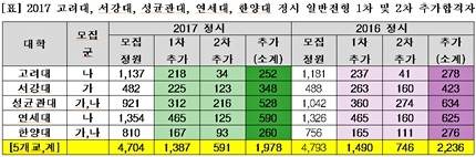 [쿠키뉴스=김성일 기자] 연세대와 고려대, 서강대, 성균관대, 한양대가 8일 2017학년도 정시 1, 2차 추가 합격자 발표를 마무리했다. 현재까지 이들 대학의 추가 합격자 수는 1,978명으로 전년도 2,236명보다 258명 감소했다.