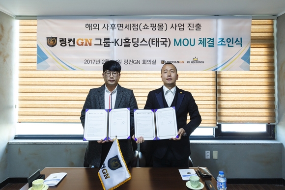 [쿠키뉴스=정수익 기자] 금융, 부동산, 바이오 등 종합투자전문회사인 링컨GN그룹(회장 박경남)은 27일 경기도 용인 본사에서 국내외 교육과 부동산개발 등 투자회사인 KJ홀딩스(대표이사 김용준)와 ‘동남아지역 사후면세점(쇼핑몰) 진출 협력’을 위한 양해각서(MOU)를 체결했다고 밝혔다.