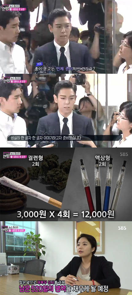 이날 방송에서는 탑이 받을 처벌과 관련한 이야기가 오갔다. 한 변호사는 “추징금 1만2000원은 대마 흡연 비용을 1회당 3000원으로 잡아 계산한 것”이라고 설명했다. 또 “탑에 징역 10월에 집행유예 2년이 구형됐다”면서 “징역 1년6개월 이상의 처벌이 주어질 가능성은 작다. 재복무 심사를 거쳐 남은 520일 의 병역을 채우게 될 것”이라고 덧붙였다.
