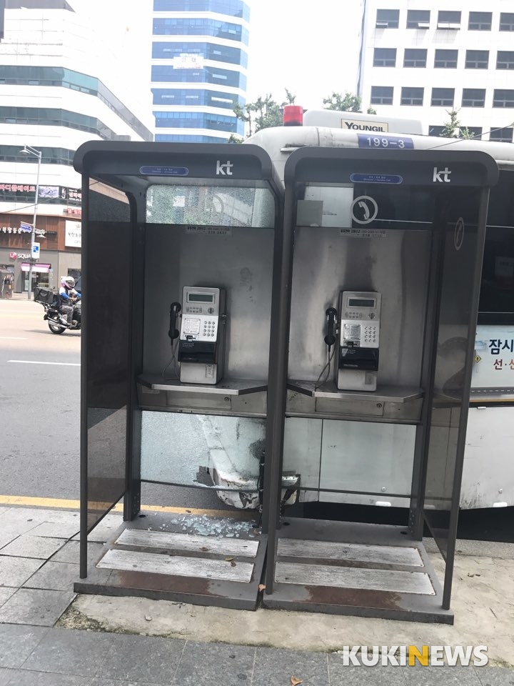 [쿠키뉴스=송금종 기자] 경찰버스가 운전 부주의로 멀쩡한 공중전화 부스를 망가뜨렸다. 20일 오후 1시 50분경 서울 중구 태평로 삼성본관 부근에 주차해 있던 경찰버스가 출발 도중 후면부가 공중전화와 부딪혀 공중전화 유리가 산산조각이 났다.