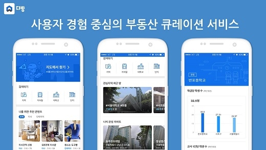 이번 리뉴얼의 핵심은 사용자 경험(UX) 중심의 개인 맞춤형 서비스다. 이를 위해 다방은 앱 실행 시 사용자가 가장 먼저 마주하는 홈 화면을 전면 개편하고 아파트 단지 정보 서비스, 다방샵 등의 서비스를 추가했다.