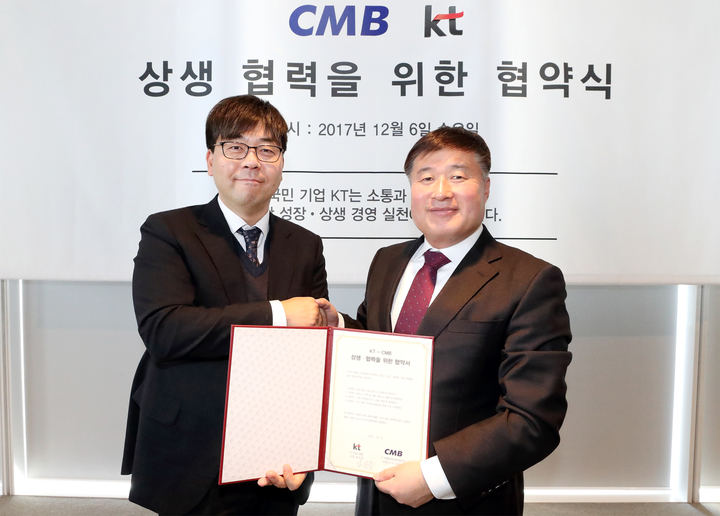 KT는 6일 서울 종로구 KT 광화문지사에서 케이블방송사 CMB과 ‘이동통신‧케이블 동등결합상품 출시를 위한 업무협약(MOU)’을 체결했다. CMB는 케이블방송사업자로 서울, 대전, 대구, 광주 등 광역시를 중심으로 약 160만 가입자에게 서비스를 제공하고 있다.