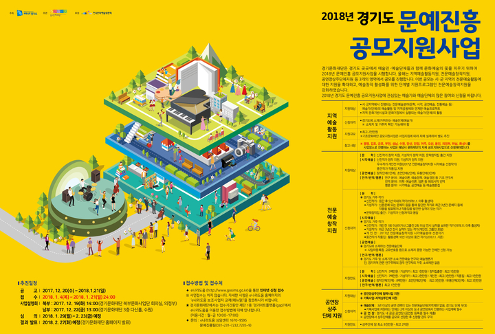 경기도와 한국문화예술위원회, 경기문화재단이 추진하는 ‘2018년 문예진흥 공모지원사업’은 2018년 1월 말부터 지원신청사업에 대한 전문가 심의를 거쳐 선정결과는 2월 말 발표할 예정이다.