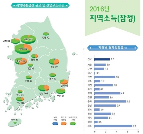 9개 도 지자체의 경우 제주(6.9%), 충북(5.8%), 경기(4.7%), 충남(3.9%), 전남(3.0%)이 상대적으로 높은 경제성장률을 기록했다. 이외 강원(2.6%), 경북(2.4%), 전북(0.9%), 경남(0.5%)는 전균 평균에 미치지 못했다.