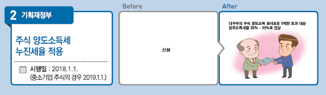 = 과세형평 제고를 위해 대주주의 주식 양도소득에 대해 누진과세 체계를 도입한다. 대주주의 주식 양도소득은 과세표준 3억원을 초과하는 부분에 대해 세율이 20%에서 25%로 인상왼다. 중소기업 주식의 경우 1년 유예 기간을 거쳐 2019년부터 적용한다.