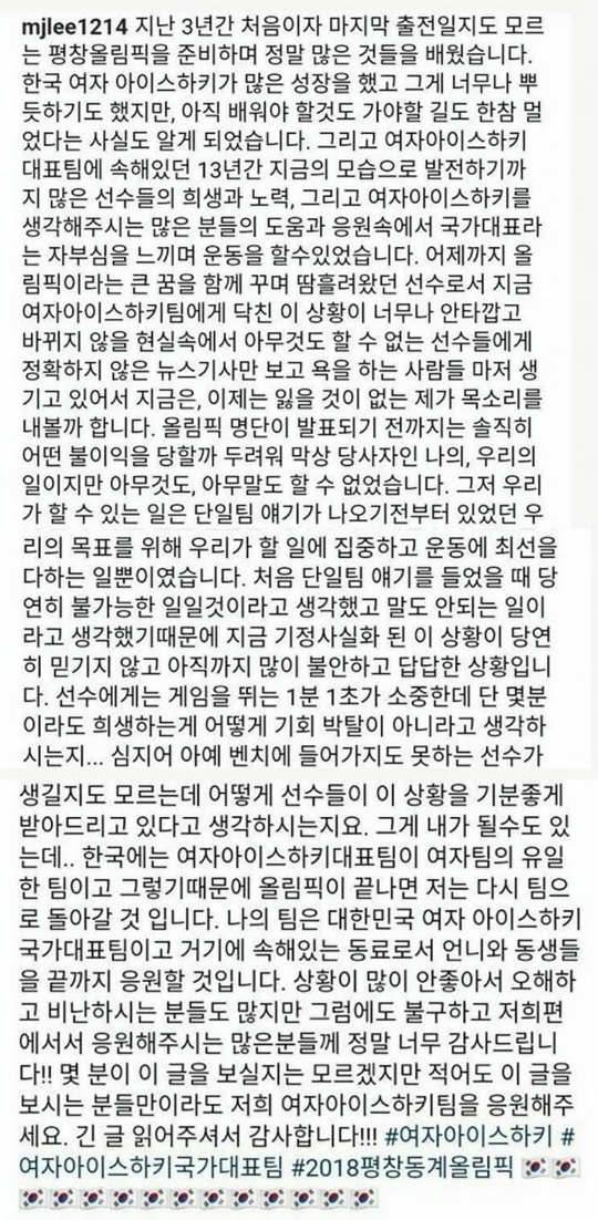 남북이 여자 아이스하키 대표팀 단일팀에 합의하면서 대표팀에서 최종 탈락한 이민지(26) 선수가 자신의 SNS를 통해 솔직한 심정을 밝혔다.