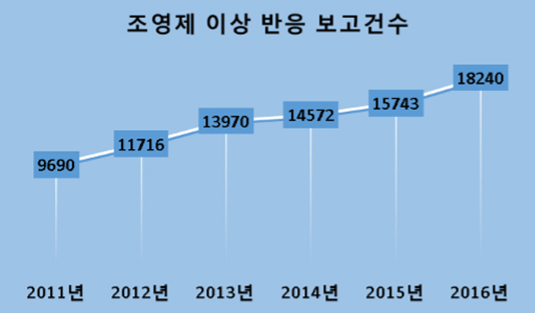 대한천식알레르기학회와 대한영상의학회가 2일 발표한 내용에 따르면 한국소비자원 조사 결과, 조영제 이상 반응 보고 건수는 2011년 9690건에서 2016년 1만8240건으로 증가했다. 2011~2016년도에 보고된 8만3931건의 조영제 이상반응 보고 건수 중 심각한 이상반응은 총 2409건이었다. 사망 사례는 14건이었다.