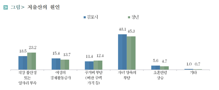 저출산 원인으로는 대다수가 ‘자녀양육 부담’(45.3%)과 ‘직장 불안정 또는 일자리부족’(23.2%)이라고 답했다. 출산계획이 있는 청년(26.9%)들은 가장 선호하는 출산지원 정책으로 ‘보육비 및 교육비 지원’(51.2%)을 꼽아 김포시 청년들이 생각하는 저출산 문제의 해결방향을 짐작할 수 있다.