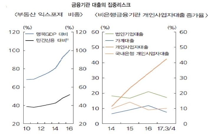 한국은행은 “특정 부문 대출이 전체대출 규모에 비해 지나치게 크거나 증가세가 빠를 경우 시장금리 상승, 부동산 경기 악화 등에 따라 해당 부분의 부실이 금융기관의 건정성을 훼손할 수 있다”고 지적했다.