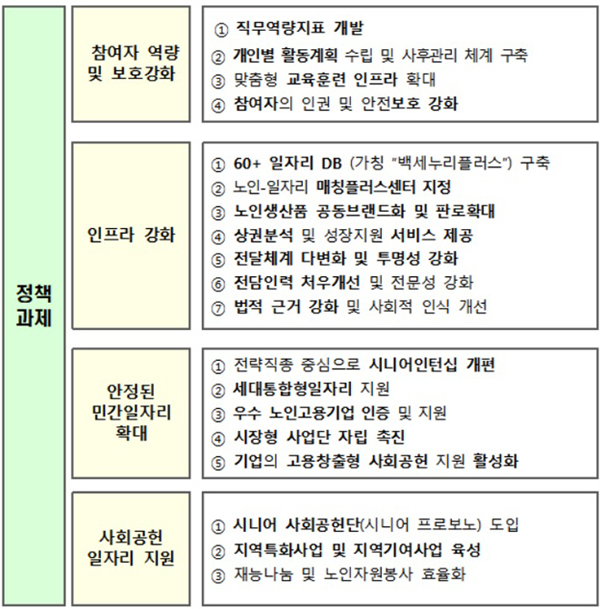 노인일자리 전달체계도 강화한다. 기존에 노인복지관, 시니어클럽 등에 한정된 일자리 참여기관의 자격을 사회적 경제기관까지 확대하는 방안을 검토한다.