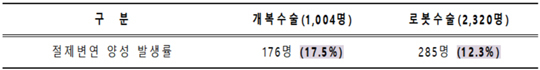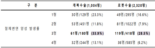 연구결과, 전립선 첨단부의 절제변연 양성 발생률은 개복수술을 받은 환자군에서 17.5%, 로봇수술 환자군에서 12.3%로 나타났다. 로봇수술에서 암 세포가 남아있을 가능성이 낮아졌다는 것을 의미한다.