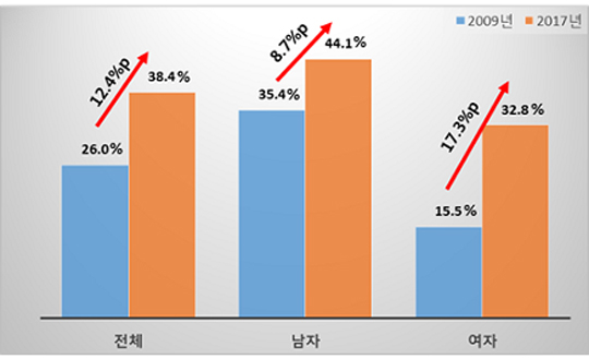 고위험음주율은 남자대학생이 23.3%로 19~29세 남성(17.7%), 성인남성전체(21.2%)보다 높았다. 여자대학생은 17.2%를 차지했다. 19~29세여성(9.6%)의 2배, 성인여성전체(5.4%)의 3배 정도 높은 수치다.