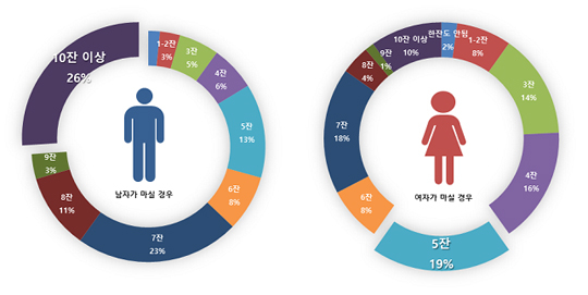 2011년 음주문화연구센터에서 발표한 연구와 비교하면 지난해 1회음주량은 남자, 여자 모두에서 ‘10잔이상’의 1회음주량이 2009년에 대비 높았다. 여자 대학생은 2배 이상 높았다.