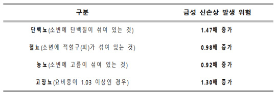 연구팀에 따르면 단백뇨가 동반된 경우에는 급성 신손상 발생 위험이 1.47배 증가, 소변 속에 수분이외의 물질이 많은 경우 즉, 농도가 높은 고장뇨의 경우에도 급성 신손상 발생 위험이 1.30배 증가했다. 혈뇨와 농뇨가 있는 경우에도 급성 신손상 예후에 부정적 영향을 끼치는 것으로 나타났다.