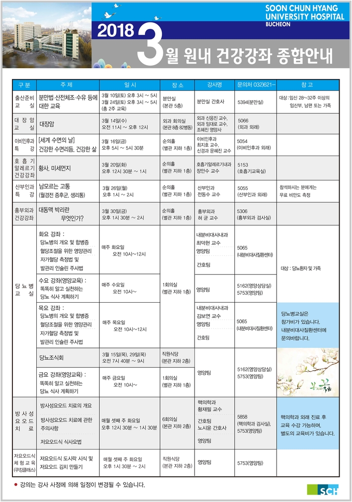 건강강좌는 사전 접수 없이 누구나 무료로 참여할 수 있으며, 상세정보는 홈페이지(http://www.schmc.ac.kr/bucheon)의 ‘행사 안내 - 3월 원내 건강강좌 종합안내’를 참조하면 된다.