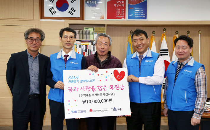 경남 하동군은 한국항공우주산업(KAI) 나눔봉사단(단장 김조원)이 7일 오전 군수 집무실을 찾아 관내 어려운 계층에 전해달라며 사회복지사업비 1000만 원을 기탁했다고 밝혔다.