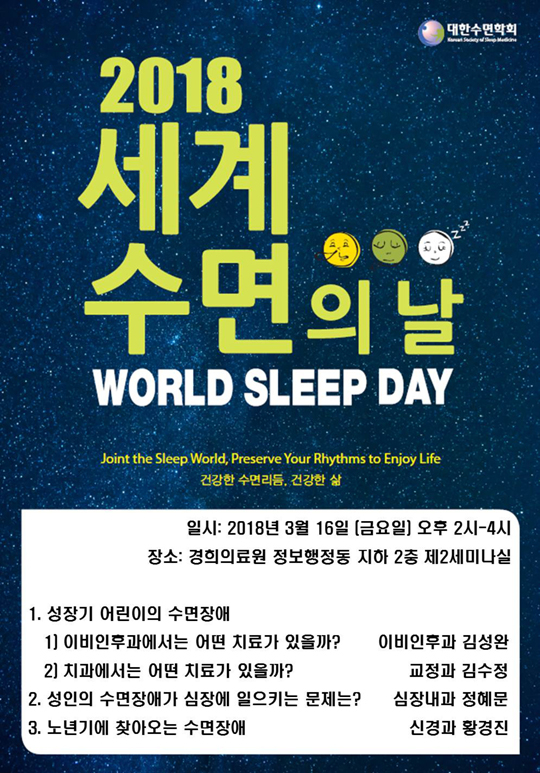 세계 수면의 날을 맞이해 진행되는 이번 공개강좌는 ▲성장기 어린이의 수면장애 – 이비인후과에서는 어떤 치료가 있을까?(경희대병원 이비인후과 김성완 교수) ▲성장기 어린이의 수면장애 – 치과에서는 어떤 치료가 있을까?(경희대치과병원 교정과 김수정 교수) ▲성인의 수면장애가 심장에 일으키는 문제는?(경희대병원 심장혈관센터 정혜문 교수) ▲노년기에 찾아오는 수면장애(경희대병원 신경과 황경진 교수)를 주제로 한 강의와 질의응답으로 시행된다.