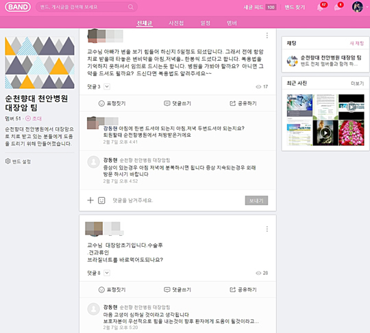아버지를 돕기 위해 밴드에 가입했다는 이모(여, 40)씨는 “대장암 수술 후 발생되는 여러 문제 해결에 정말 많은 도움이 됐다”며 “밴드 덕분에 아버지의 회복도 원만한 것 같고, 실시간 도움을 주시는 교수님들께 정말 감사하다”고 말했다.