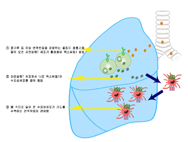 NKT 세포는 자연살해 T세포로 불리는 면역세포로 사이토카인 분비를 촉진해 다른 면역세포의 활동을 조절한다. 엑스씨엘1은 NKT 세포에서 생산하는 단백질로 다른 면역세포 이동을 유도한다. 수지상세포은 면역반응을 유발하는 물질이 유입됐을 때 면역 반응을 조절하는 면역세포로, 천식에서 기도를 수축하는 과정의 중요한 역할을 한다.