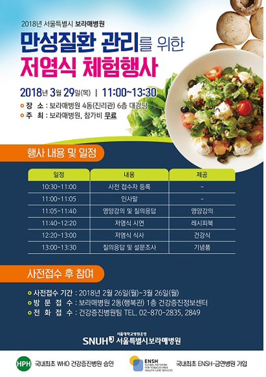 ◇보라매병원, 29일 저염식 체험행사 개최=서울대학교병원운영 서울특별시 보라매병원은 오는 29일 오전 11시부터 보라매병원 진리관 6층 대강당에서 ‘만성질환 관리를 위한 저염식 체험행사’를 개최한다고 밝혔다.