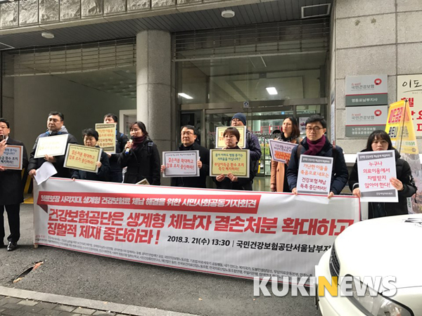 건강세상네트워크 등 시민단체와 노동조합은 21일 오후 1시 30분 국민건강보험공단서울남부지사에서 ‘의료보장 사각지대, 생계형 건강보험료 체납 해결을 위한 시민사회공동기자회견’을 개최했다. 이날 단체들은 “누구나 의료이용에서 차별을 받아서는 안 된다”며 “건강보험공단은 생계형 체납자 결손처분을 확대하고, 아파도 병원에 못가는 가난한 사람에게 건강보험체납을 독촉하거나 징벌적인 제재를 가하는 것을 중단해야 한다”고 주장했다.