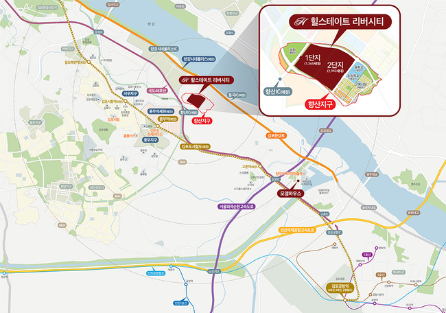 입지적으로도 우수하다는 평가로 일부 세대에 한해 한강 조망권이 확보되는 것은 물론 김포한강로와 김포대로가 인접해 있어 서울로의 접근성도 좋다.