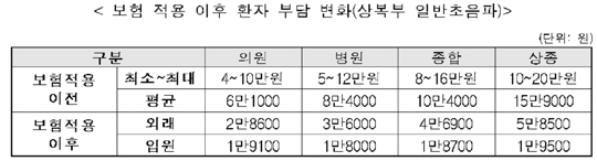 복지부는 이번 급여화 확대로 B형·C형 간염, 담낭질환 등 상복부 질환자 307만여명의 의료비 부담이 평균 6∼16만원에서 2∼6만원 수준으로 크게 경감될 것으로 전망했다.