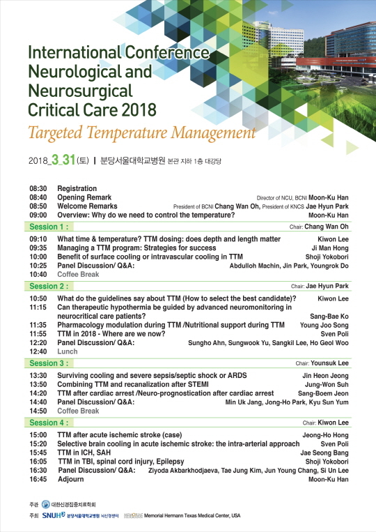 이번 심포지엄의 프로그램 구성과 진행을 맡은 분당서울대병원 신경과 한문구 교수(뇌신경센터 뇌신경계중환자부)는 “국내에서 신경계 중환자 치료와 저체온치료에 대한 관심이 날로 커져가고 있는 가운데 이번 심포지엄을 통해 뇌신경계질환을 치료하는 의사들에게 목표체온유지치료에 대한 필요성과 다양한 최신지견을 공유하는 유익한 시간이 되길 바란다”고 전했다.
