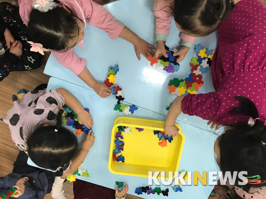 기자는 만3세 아이들이 있는 믿음 1반을 맡았다. 교사 1명이 15명을 책임져야 하는 상황을 경험하는 것이 좋을 것 같다는 원장의 권유에서다. 장난감, 책, 스티커 등을 가지고 자유롭게 선택활동을 하던 아이들은 기자가 반에 들어가자 이것저것 묻기 시작했다. 낯가림은 찾아볼 수 없었다. “선생님은 누구세요?”, “저는 다빈(가명)이에요. 얘는 수정(가명)이에요”, “저희는 지금 이걸 가지고 놀고 있어요”, “선생님이 좋아요”, “저는 이걸 잘해요”, “안아주세요”. 7~8명의 아이들이 한꺼번에 다가와 안기거나, 뽀뽀를 하며 자신들을 소개했다.