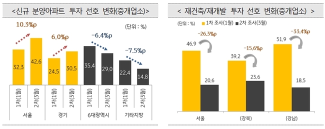 재건축 및 재개발 아파트는 정부 규제가 지속되면서 투자 선호도가 1월 33.0%에서 3월 18.0%로 2개월 만에 크게 하락했다. 특히 서울에서 재건축 및 재개발 아파트 선호도의 경우 46.0%에서 20.6%로 절반이상 떨어져 하락세가 두드러졌다.