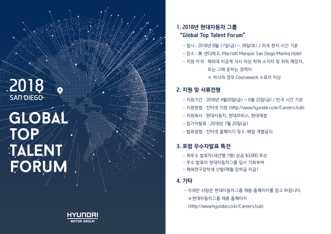 현대자동차그룹은 오는 8월 17~18일 이틀간 미국 샌디에이고(San Diego)에서 ‘현대자동차그룹 글로벌 탑 탤런트 포럼(Hyundai Motor Group Global Top Talent Forum)’을 개최, 해외 이공계 석·박사급 우수인재 발굴에 나선다.