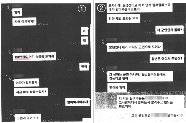 # A씨는 군대간 아들B씨로부터 80만원을 송금해 달라는 카카오톡 문자를 받았다. 아들은 군대 선임이 빌려달라고 해서 자신이 돈을 마련해야 한다며 A씨에게 돈을 보낼 줄 것을 재촉했다. 마지못해 A씨는 아들에게 80만원을 송금해 주면서 꼭 받을 것을 당부했다. 하지만 다음날 아들로부터 전화를 받은 후 자신이 보이스피싱에 당했다는 것을 알아차렸다. 아들이 A씨에게 그런 문자를 보낸 적이 없다고 했기 때문이다. 그제야 A씨는 카카오톡을 통한 보이스피싱 피해사실을 경찰에 신고했다.