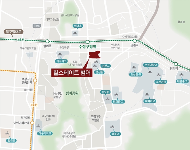 현대엔지니어링 ‘힐스테이트 범어’가 들어서는 범어동은 대구의 중심 주거지답게 교통과 주거 편의시설도 다양하게 갖추고 있다. 단지에서 도보로 대구 도시철도 2호선 수성구청역을 이용할 수 있는 역세권에 위치해 있다.