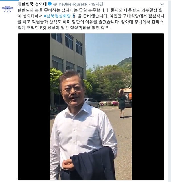 이날 문 대통령은 청와대 구내식당에서 점심을 먹고, 직원과 산책을 했다. 해당 방송에서 문 대통령은 시청자들에게 인사를 전했다. 정상회담 준비에 대한 질문에는 “잘 할게요”라고 답했다.
