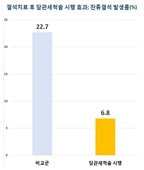 연구팀은 담관세척술을 받은 환자 73명과 받지 않은 환자 75명로 분류해 관찰하는 방식으로 연구를 진행했다. 그 결과 총 22명에게 잔류결석이 발견됐지만, 이중 담관세척술을 시행한 환자들은 5명에게만 잔류 결석이 확인됐다. 이는 비교그룹보다 3배 이상 감소한 수치다.