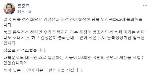 홍 대표는 남북정상회담 공동선언문이 발표된 직후 자신의 사회연결망서비스(SNS)를 통해 정상회담을 “김정은과 문정권이 합작한 남북 위장평화쇼에 불과했다”고 전했다.