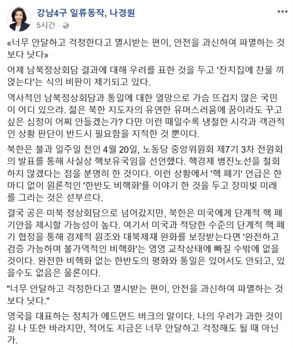 이어 “역사적인 정상회담과 통일에 대한 열망으로 가슴 뜨겁지 않은 국민이 어디 있겠는가”라며 “다만 이런 때일수록 냉철한 시각과 객관적인 상황 판단이 반드시 필요함을 지적한 것”이라고 해명했다.