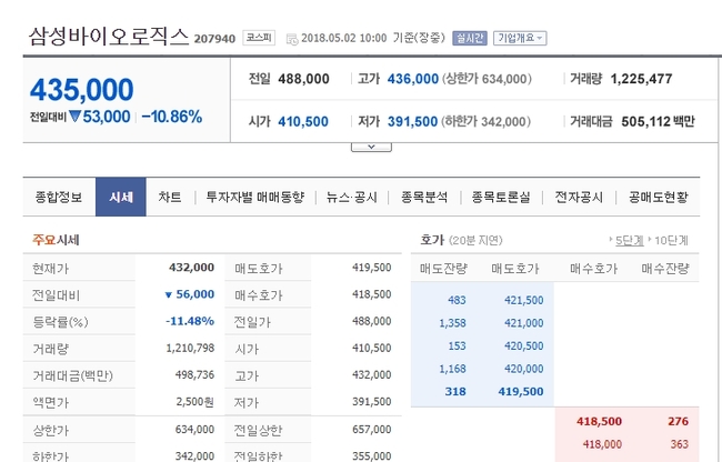 2일 오전 10시 현재 삼성바이오로직스는 전거래일 대비 5만3000원(10.86%) 내린 43만5000원에 거래되고 있다. 이날 삼성바이오로직스는 전거래일 보다 7만7500원(15.88%) 내린 41만500원에 장을 시작했다.